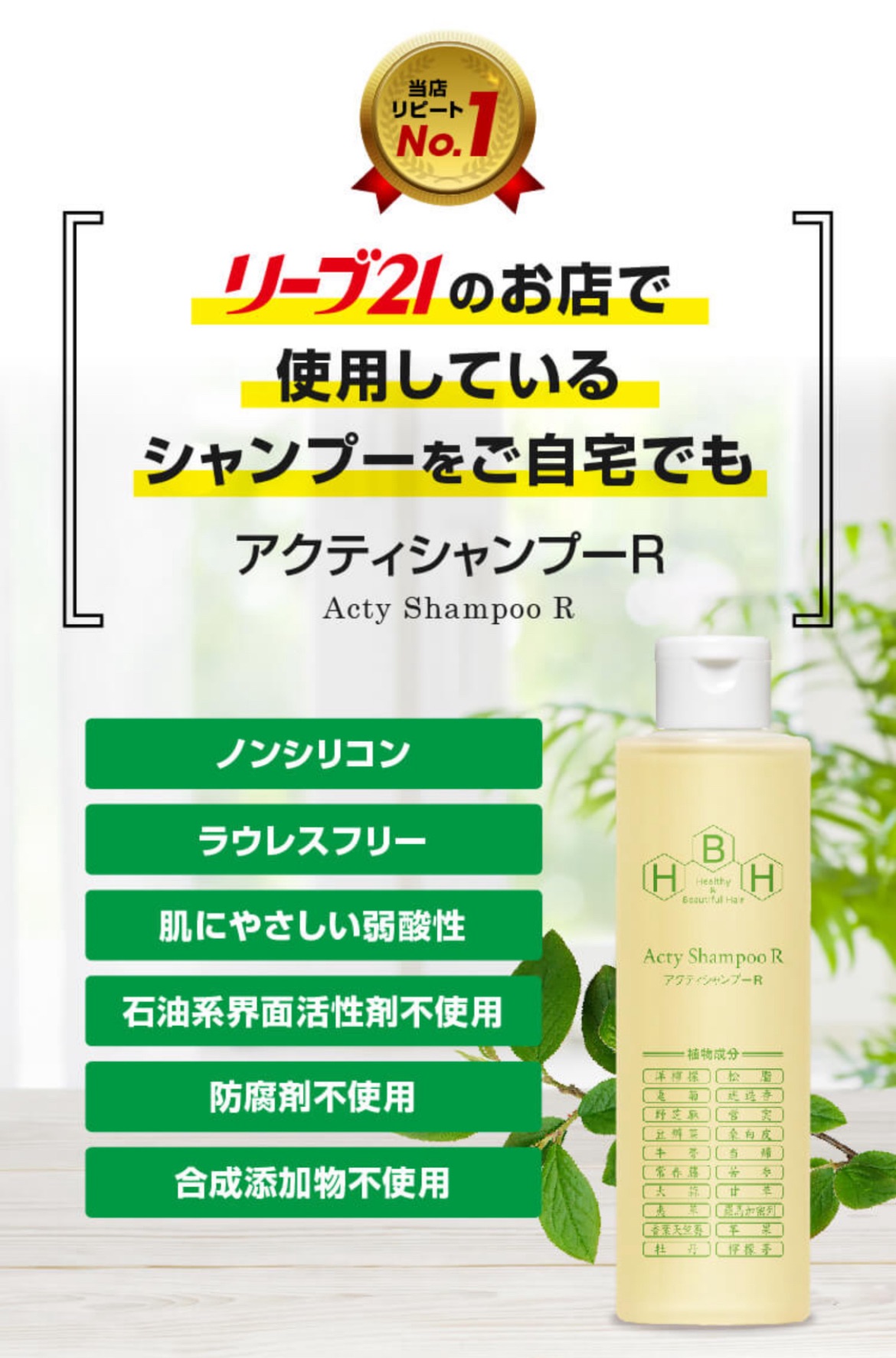 CMでおなじみの発毛専門リーブ21が店舗で使用している シャンプー(アクティシャンプーR)は改良を10回以上繰り返し、常に進化し続けている実力派シャンプー。