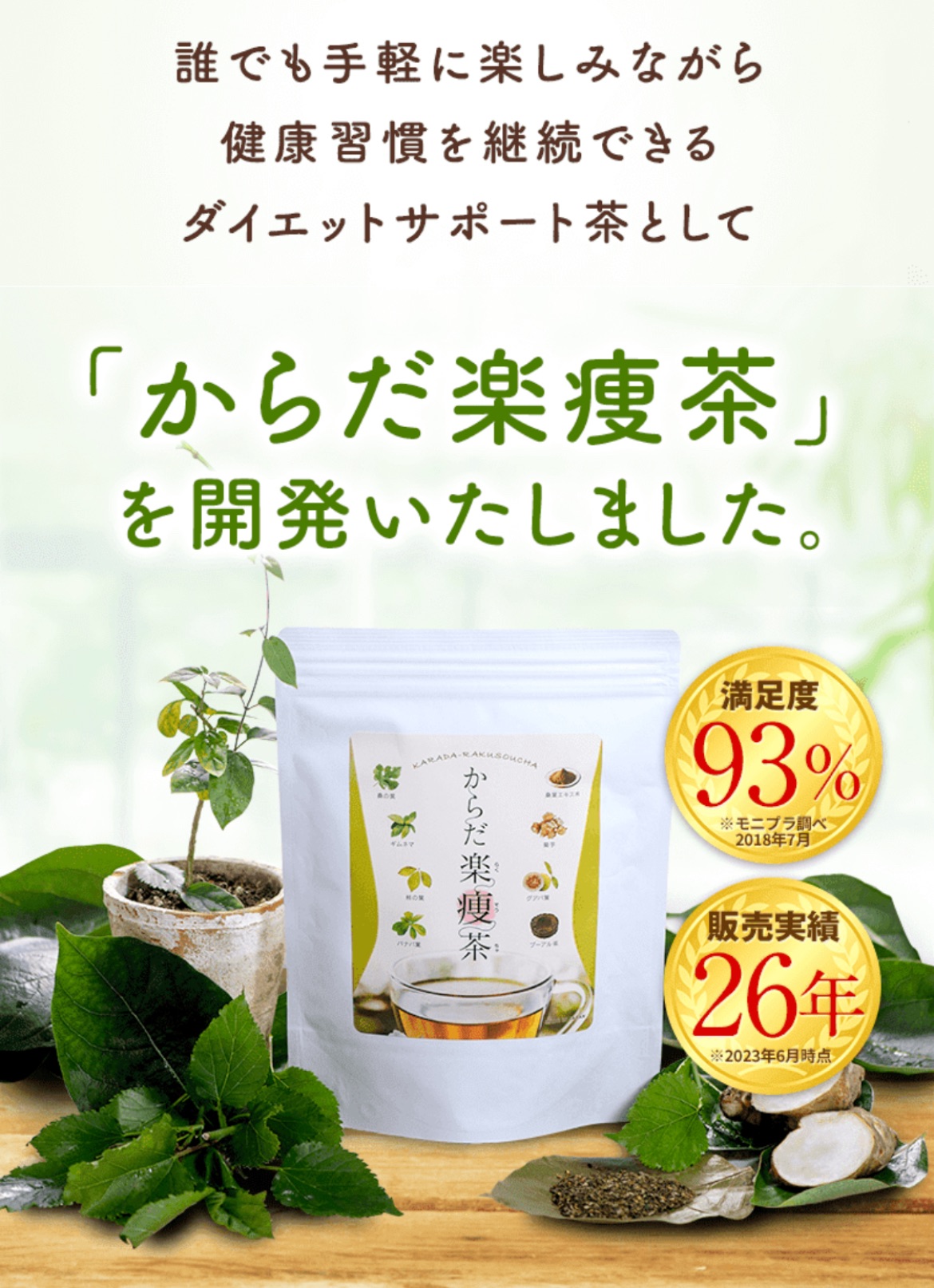 忙しい日々でも、健康的なダイエットをサポート。からだ楽痩茶は、薬剤師の森が厳選した桑葉、ギムネマ、菊芋などにより開発した健康茶です。