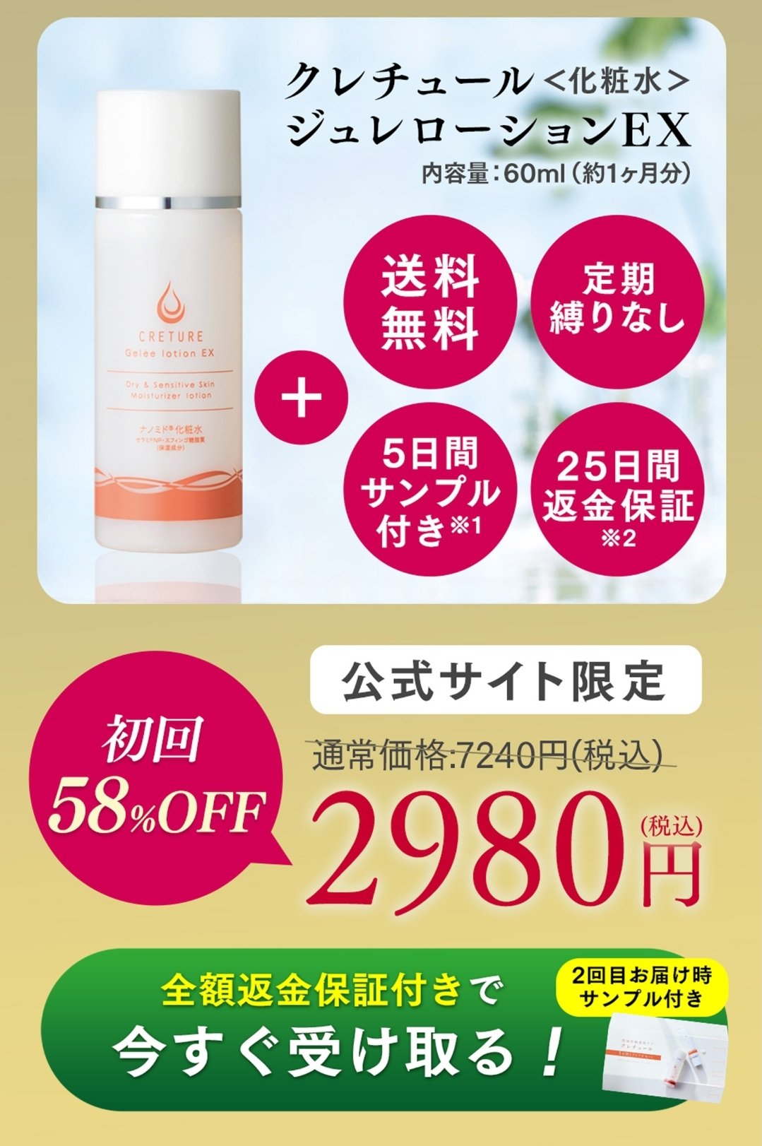 クレチュールジュレローションEXは敏感肌の方も安心してお試しいただくために25日間全額返金保証付き!もちろん開封後でもOK。