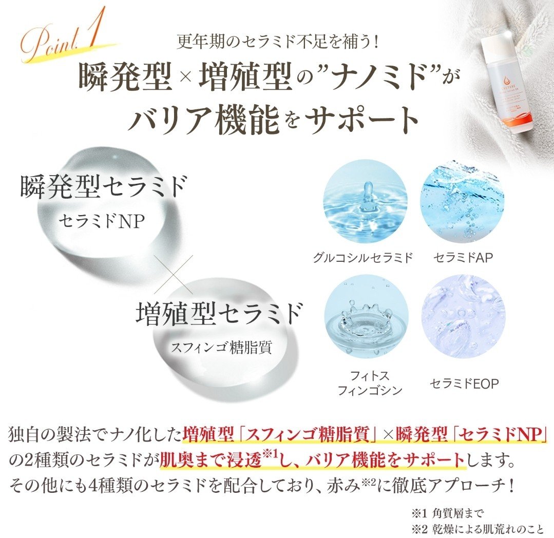 ナノ化したオリジナル成分「ナノミド」配合により【瞬発型セラミド】×【増殖型セラミド】の2種類のセラミドが角質層まで浸透しバリア機能を徹底サポートします。