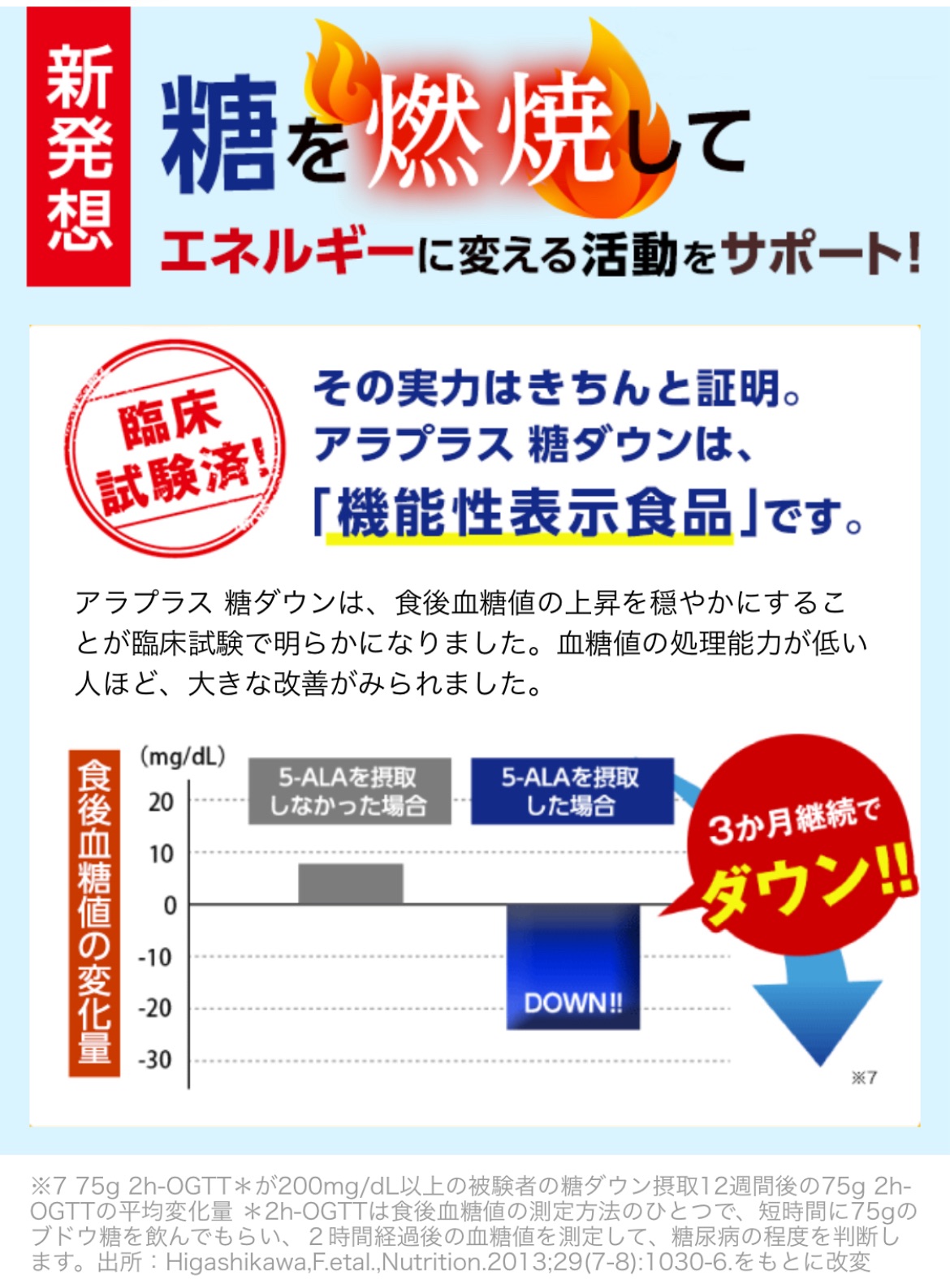 本品は5ーアミノレブリン酸リン酸塩を含み、 高めの空腹時血糖値を 正常に近づけることをサポートし、食後血糖値の上昇を穏やかにする機能があります。血糖値が高めの方に適しています。