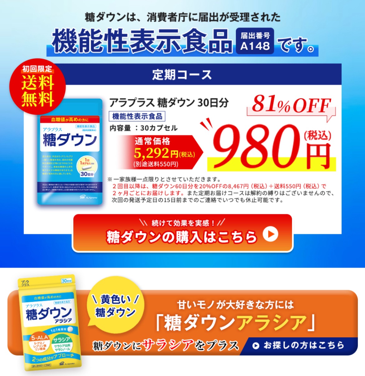 アラプラス 糖ダウンは、血糖値が気になる方に向けて開発された機能性表示食品です。